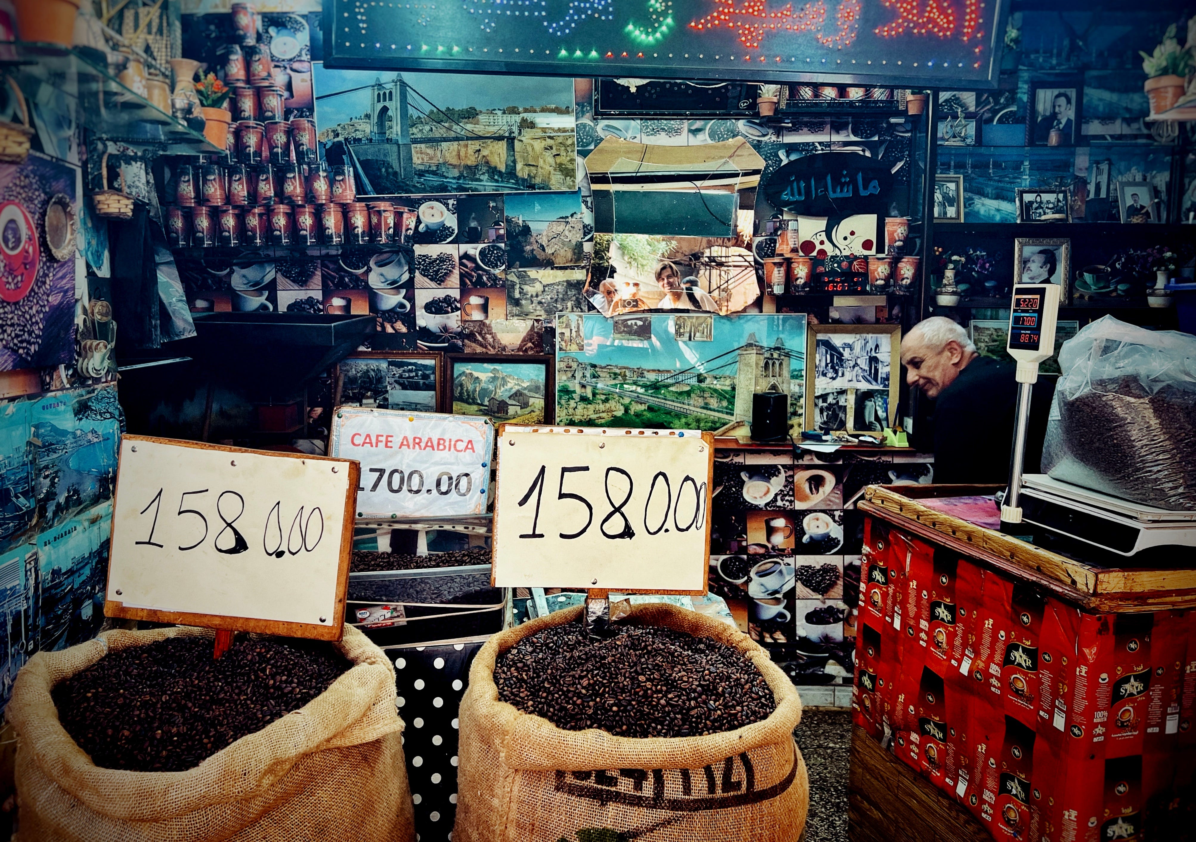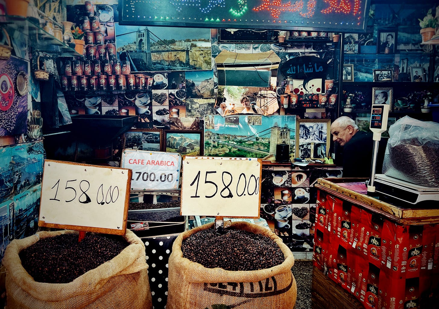 We walk through the old, lively city, full of historic buildings and the bazaar: roaring scooters, honking, swarming people, street food, big sacks of spices, and live chickens that are sold for about €1.45 each.